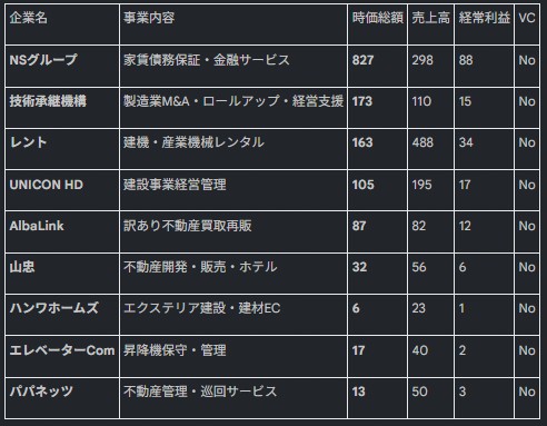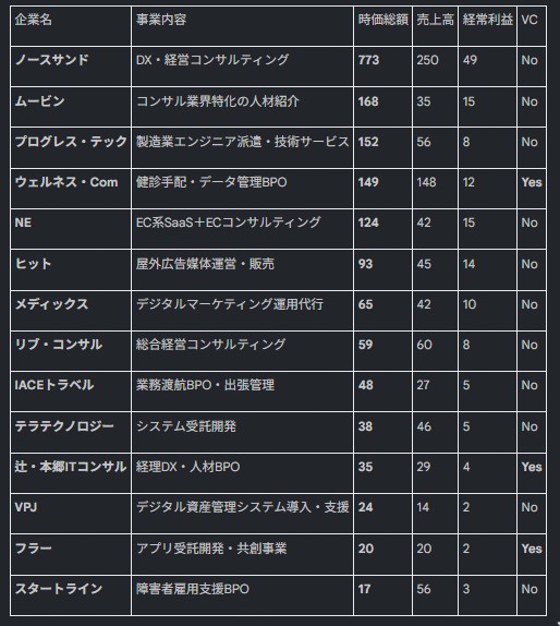 VCがゼロの領域であり、平均売上高(149億円)は全領域で最大です。NSグループ(時価総額827億円)や技術承継機構(時価総額173億円)が象徴的であり、特に技術承継機構は製造業のM&Aロールアップにより、短期間で好業績を実現しており、2025年12月現在の時価総額ベースでは840億円まで株価が上がっています。「時間を金で買う」モデルとして、ゼロイチのスタートアップよりも成功した1社かもしれません。