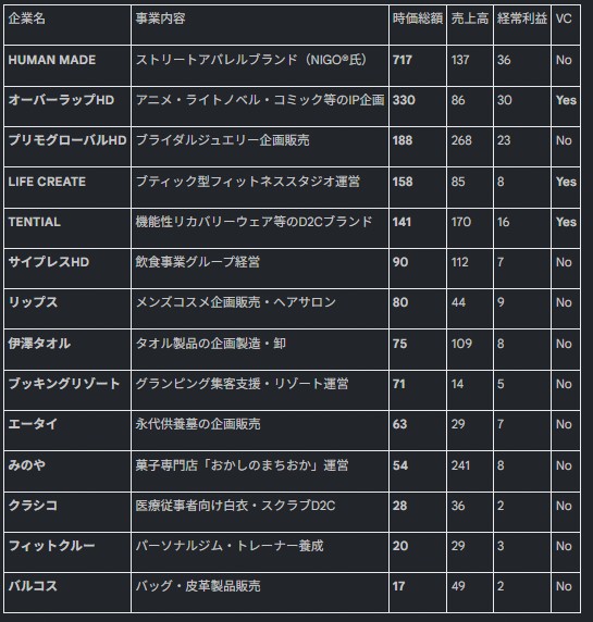 特筆すべきは、HUMAN MADE(時価総額717億円/利益36億円)です。NIGO氏のクリエイティビティによるブランド力がけん引する同社は、多くのTech企業の業績や時価総額を凌駕しています。 一方で、TENTIAL(時価総額141億円)やLIFE CREATE(時価総額158億円)などVC Backedな企業も成功しており、ブランドストーリーを組み合わせたD2Cモデルや店舗ビジネスのの再現性の高さが証明されました。