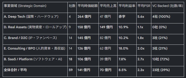 まずは、全体感を調べてみました。事業領域「Deep Tech」「SaaS / Platform」「Brand / D2C」「Real Assets」「Consulting / BPO」とざっくり5分類した上で、平均時価総額が大きい順に並べ直しております。