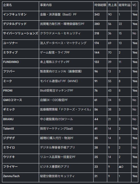 例外は、インフキュリオン(時価総額342億円)やデジタルグリッド(時価総額280億円)のような「社会インフラ型プラットフォーム」です。金融や電力といった巨大産業の取引基盤を押さえていることが、高評価の要因かもしれません。